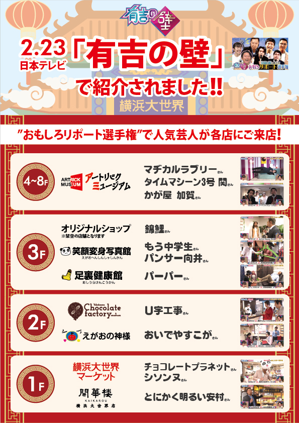 2/23(水祝)19:00~放送の日本テレビ「有吉の壁」in 横浜 2時間SPで横浜大世界全館が放送されました!