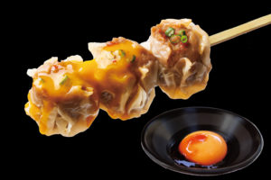濃厚な卵黄を絡めて極上の旨味を堪能できる「月見牛鍋シュウマイ串」