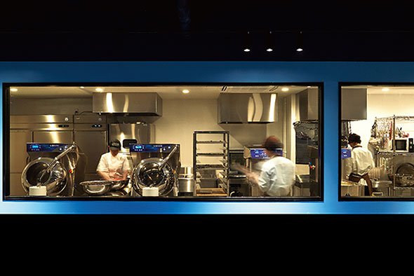 ●ガラス張りのファクトリー併設でライブ感たっぷり!奥にはチョコレート作りが体験できるスペースも!